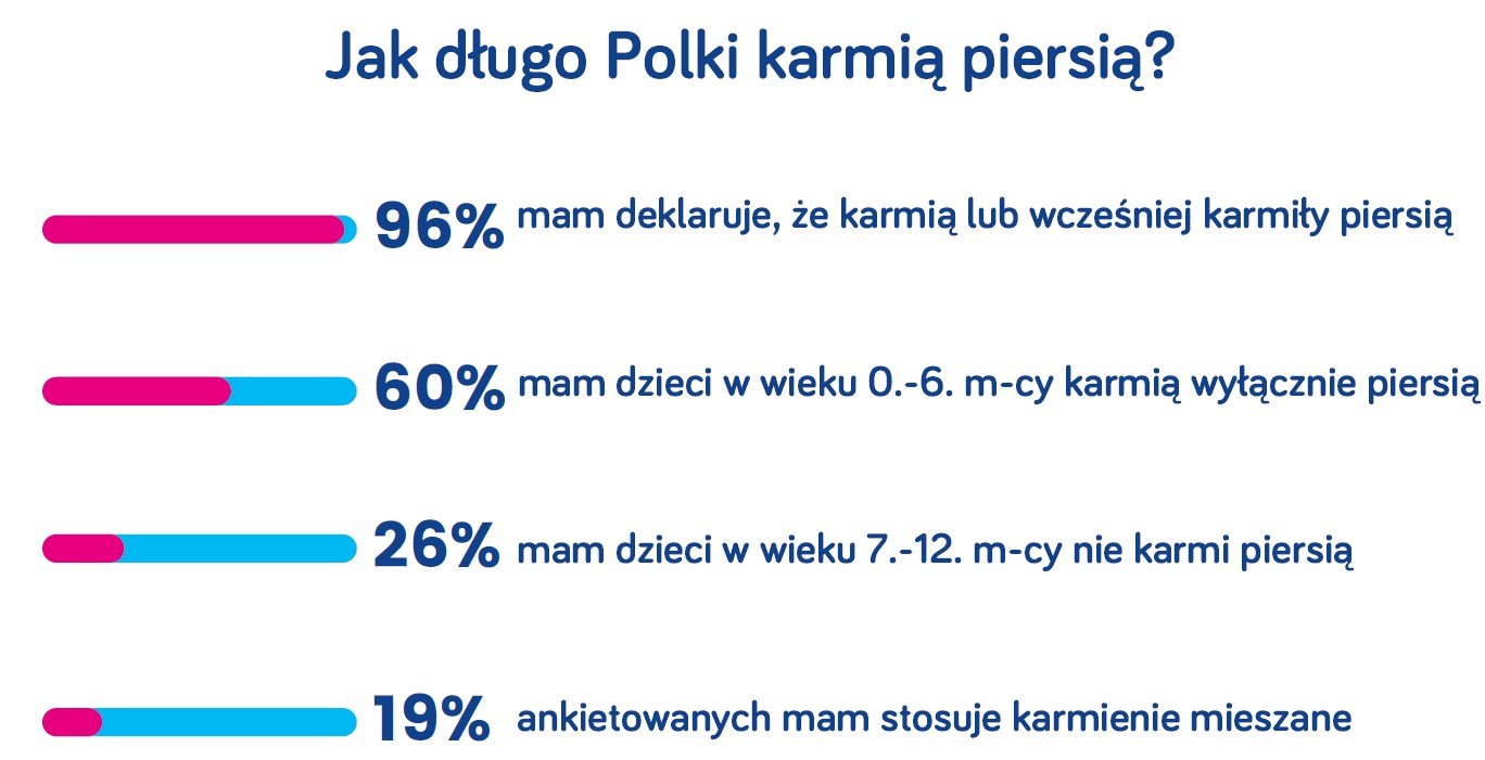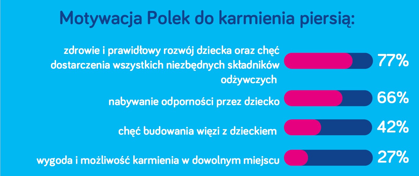 Zdecydowana większość Polek decyduje się na karmienie piersią ze względu na troskę o zdrowie i prawidłowy rozwój maluszka – kobiety wiedzą, że w swoim mleku przekazują niezbędne składniki odżywcze kluczowe w procesie nabywania odporności dziecka. Wymieniają także chęć budowania więzi z niemowlęciem oraz zwracają uwagę na fakt, że karmienie piersią jest po prostu wygodne. 60% mam dzieci w wieku 0-6 miesięcy karmi wyłącznie piersią, a 74% kontynuuje karmienie piersią dzieci w przedziale wiekowym od 7. do 12. miesięcy.